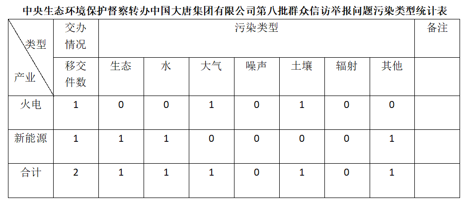 2025年6月11日,中央第七生態環境保護督察組向中國大唐集團有限公司移交第八批群眾信訪舉報件,共計2件,均為來電舉報,涉及生態問題1個、水問題1個、大氣問題1個、土壤問題1個、其他問題1個。所有舉報件辦理工作已第一時間進入調查核實辦理程序,辦理情況將按照相關要求反饋督察組,并及時向社會公開。